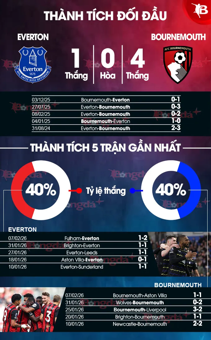 Thống kê đối đầu gần đây đang nghiêng hẳn về phía Bournemouth khi họ thắng tới 5 trong 6 lần gặp Everton.