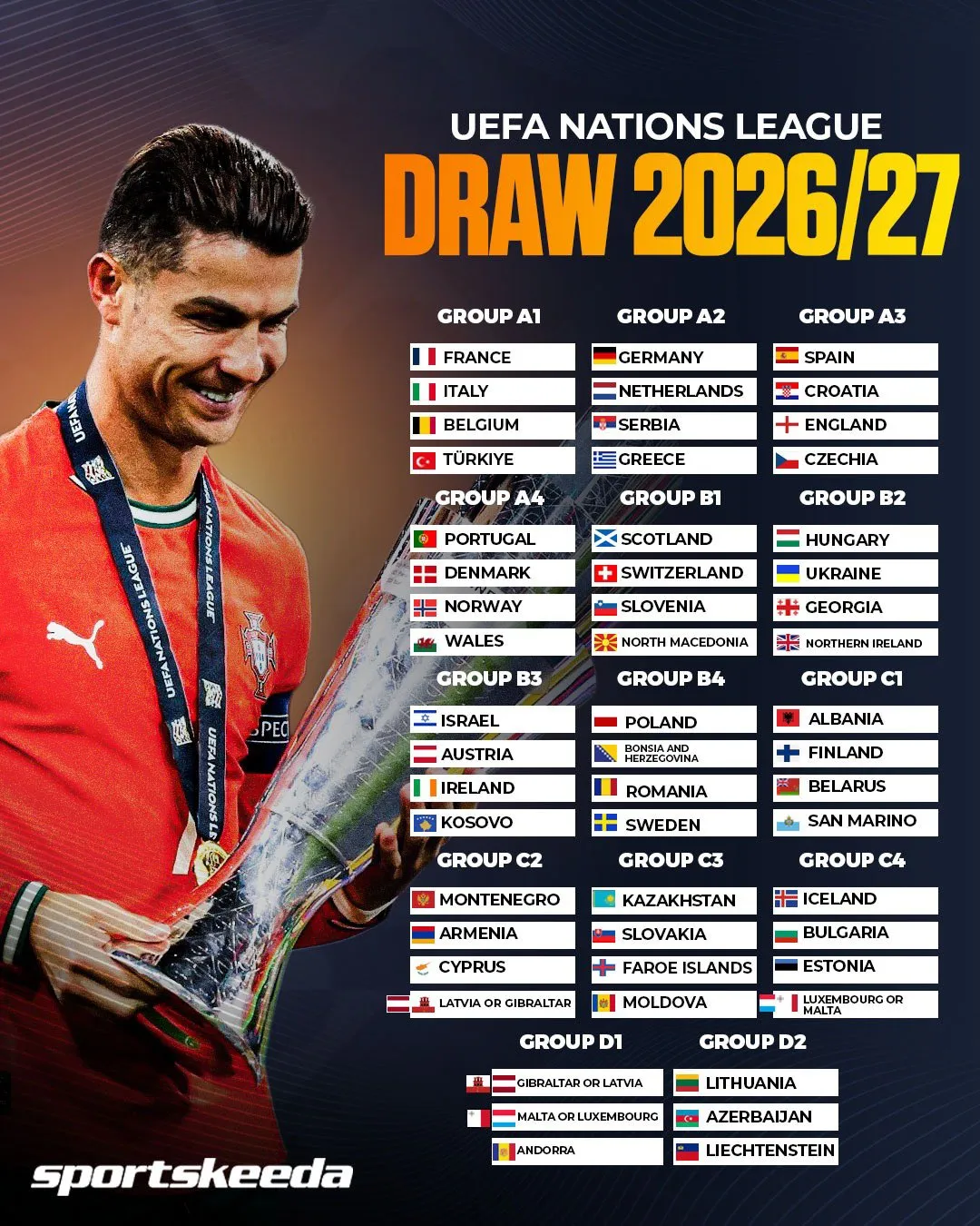 Cuộc đối đầu đầy hấp dẫn giữa Bồ Đào Nha và Đan Mạch đã được tái lập tại vòng bảng Nations League 2026/27. Đội tuyển Đan Mạch, với ngôi sao Rasmus Hojlund, chắc chắn sẽ tìm cách trả thù sau thất bại 3-5 chung cuộc trước Bồ Đào Nha ở tứ kết mùa giải trước, nơi Cristiano Ronaldo tỏa sáng.
