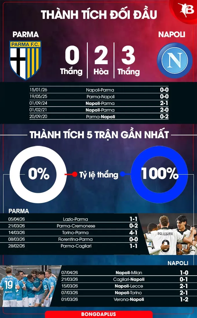 Lịch sử đối đầu cũng nghiêng hẳn về phía Napoli. Trong 11 lần gần nhất làm khách trên sân Parma, đội bóng thành Naples đã giành tới 6 chiến thắng, chỉ nhận 2 thất bại. Đây sẽ là cơ sở tâm lý vững chắc để họ hướng tới một kết quả tích cực.