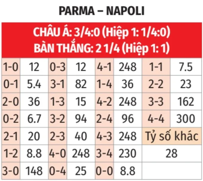 - Bàn thắng sớm ở hiệp 1: 7/10 cuộc chạm trán gần nhất giữa hai đội chứng kiến ít nhất một bàn thắng được ghi trong hiệp một. Xu hướng này cũng xuất hiện ở 2/3 trận gần đây của Parma và tới 18/20 trận vừa qua của Napoli.